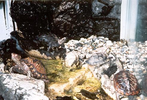 現在我將龜分置於大雜院.水濂洞.小木屋.水晶宮.及玻璃屋五區大雜院是將陽台的三分之一改建而成,目前成員有公小蘇27公分,公緬星15公分,母食蛇15公分,母黃頭14公分,母紅腿15公分