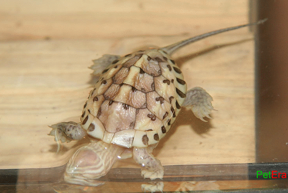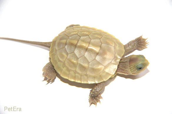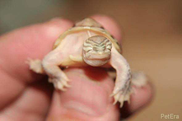 在同一批個體中,就出現了這一隻沒有雙眼的個體,說是白化,不過牠的背甲上卻散佈著深色的斑點,據說比全白化的更稀有.由牠那尚未完全吸收的卵囊看來,應該只有1-2星期大.這隻特殊的個體在兩個眼睛的部位都是平滑的皮膚,完全沒有眼睛的痕跡.站長很努力的搜尋自己的記憶,卻想不出有任何類似的報導.所以這隻龜,雖然不一定是後無來者,卻很可能是前無古人的.而這樣一隻龜卻活生生的出現在台灣.能夠親眼見到這樣一隻龜,實在可以說是三生有幸,養了這麼多年的龜,見到一次就值得了.相信見過的人都有同感.