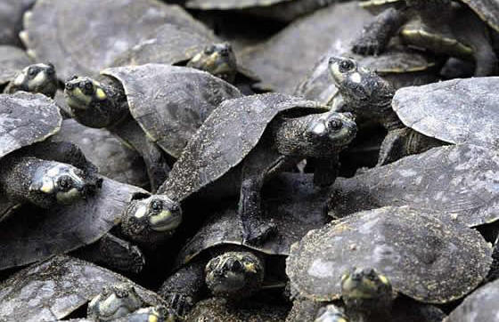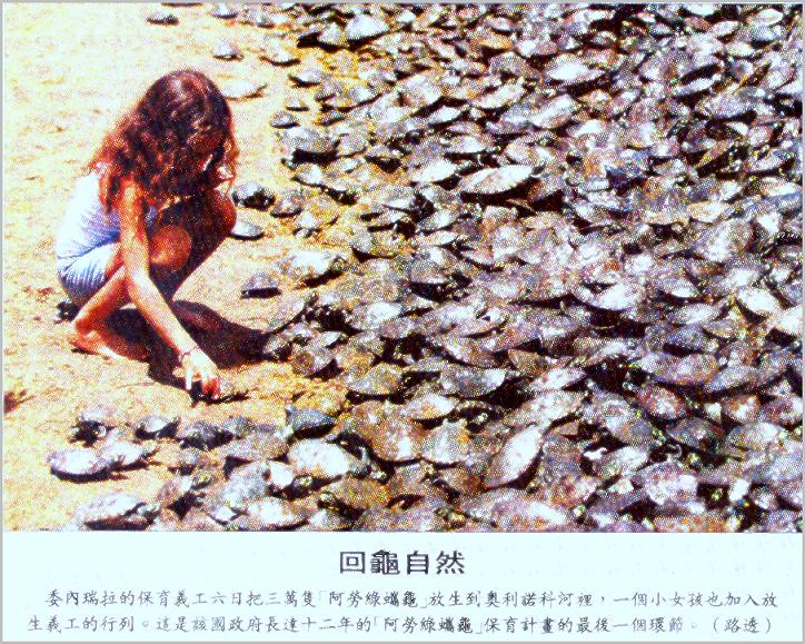近年來南美洲的生態保育一直是國際注意的焦點.日前 在國際和國內媒體上都刊載了一宗消息是有關委內瑞拉政府當局每年一度的河龜放生活動.當地的委內瑞拉科學發展基金會人員在亞馬遜河支流的奧立諾科河岸(Orinoco river)釋放了三萬隻人工繁殖的巨人側頸龜Podocnemis expansa(Arrau turtle),這裡原本就是牠們主要的棲息地,希望牠們的數量可以恢復到從前的水準.該基金會每年在這個區域蒐集數以萬計的初生幼龜,經過人工養殖一年之後再釋放,以增加牠們存活的機率.這個計畫已經執行11年,釋放了120,000隻以上的亞馬遜側頸龜,由於牠們的成熟期長達15年,因此再過幾年,就可以看到牠們上岸產卵了.記者稱之為阿勞綠蠵龜也實在有創意.