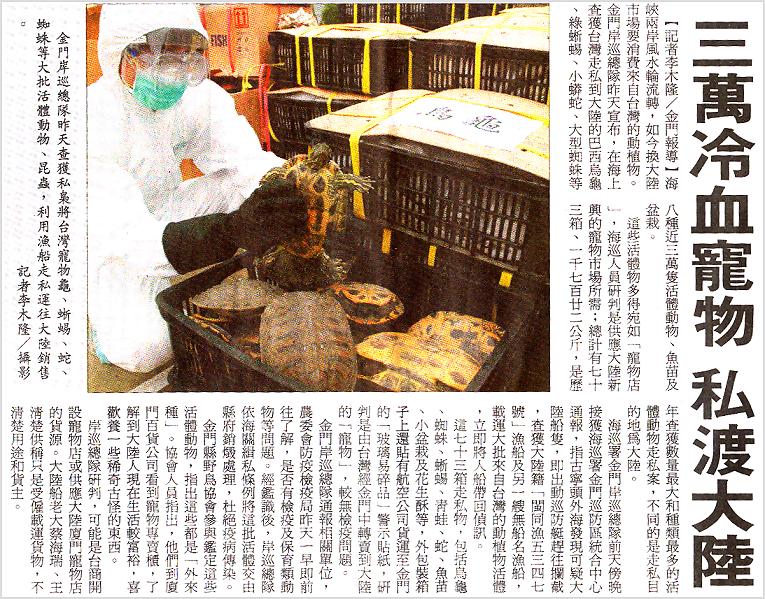 相對於委內瑞拉的保育活動,台灣的保育活動就少得多了.倒是動物走私的消息比較多.在聯合報刊出委內瑞拉放生活動的第二天,就刊登了一宗走私爬蟲遭查獲撲殺的消息,可說是滿強烈的對比