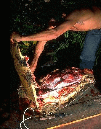 雖然在原生地受到保護,但是當地土著仍然習慣飼養或獵捕巨人側頸龜做為肉類來源.由左邊的照片中可看出側頸龜如何被宰殺,一隻在當地市場可以賣100美金.