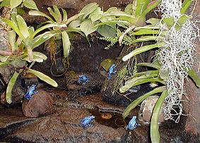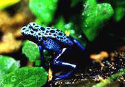 Savannah)的區域,這個區域海拔約400公尺,中央是一片溫暖潮濕的熱帶雨林,這就是牠們的家鄉.牠們喜歡在濱臨溪流的河岸岩石上活動覓食,屬於日行性的地棲型蛙類,但是也偶而會跳上樹活動.鈷藍箭毒蛙最與眾不同的一點就是牠沒有任何色彩變異的個體或亞種,其實也只要一種就足夠令人讚嘆不已了.