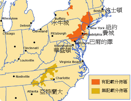 美國東北部麻州以南到喬治亞州 |