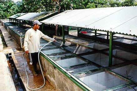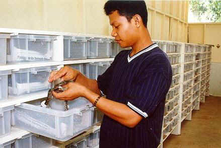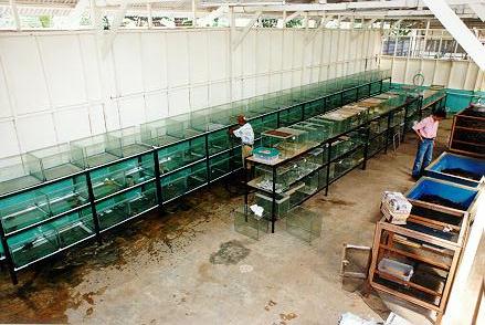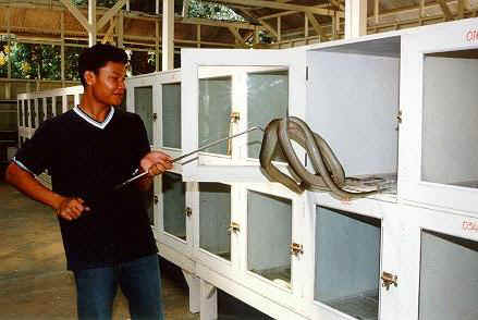 比較起來,東南亞的繁殖場就比較專注於稀有而高價的種類,規模也比較小,主要是供應鄰近的亞洲國家.因為氣候適中,所以設備也比較簡單,這家繁殖場是以繁殖蛇類為大宗,龜龜則以棕靴,黃頭,豬鼻等本土種為主,其他巨蜥,老爺樹蛙,守宮,蜥蜴等都有繁殖,比較特別的是哺乳類的懶猴和眼鏡猴也能量產,台灣有許多物種都是直接或間接來自於這家繁殖場.