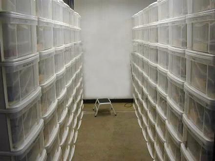 由於美國氣溫較低,所以整個繁殖場都是以溫室的方式佈置,透明塑膠布可以視狀況需要開闔,兼具採光與保溫,十分方便.這個繁殖場是以美國國內市場為主,所以繁殖的爬蟲都是比較大眾化的一般種類,所以產量也很驚人.
