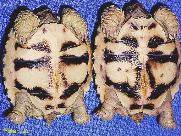 | 左邊雄龜的腹甲末端V槽較深兩個尖端也較尖銳 |