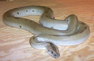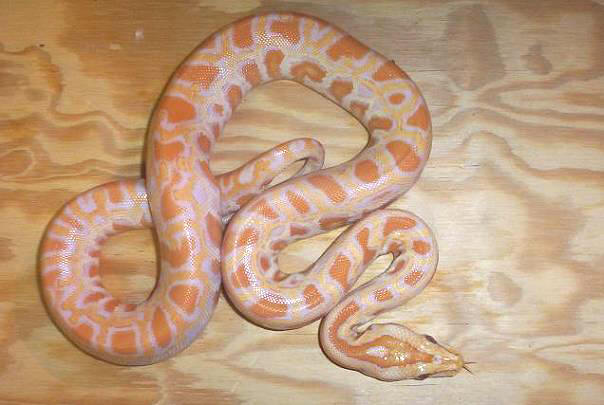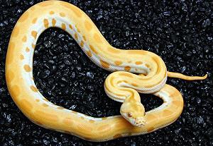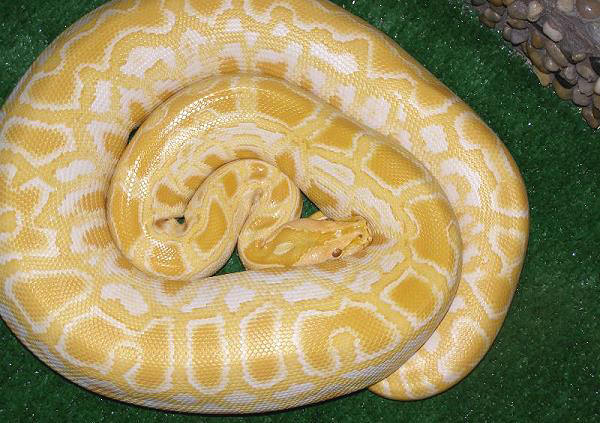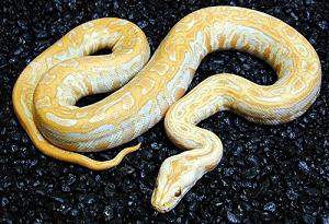 一種白化蟒蛇.當黃金蟒多年前首度出現在美國時,一條要價五千美金,曾經造成爬蟲市場一片飼養黃金蟒的熱潮.可見黃金蟒的魅力是愛蛇族所無法抵擋的.在人工