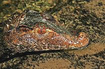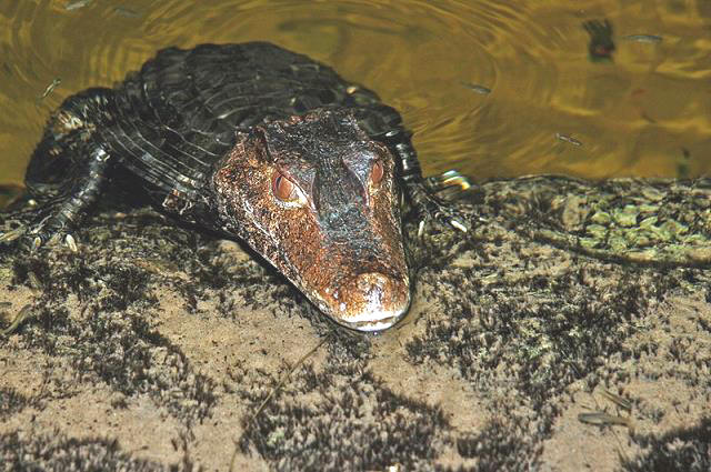 侏儒凱門鱷體色黝黑頭部兩側及眼睛部卻呈紅棕色