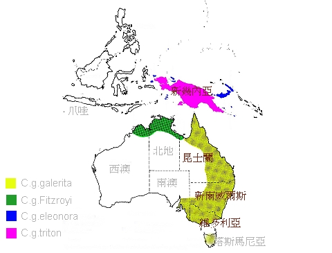2. C.g. fitzroyi   產於澳洲北部,冠羽較長,眼後無黃斑,眼圈為淺藍色.