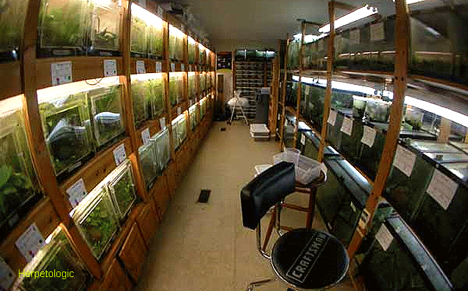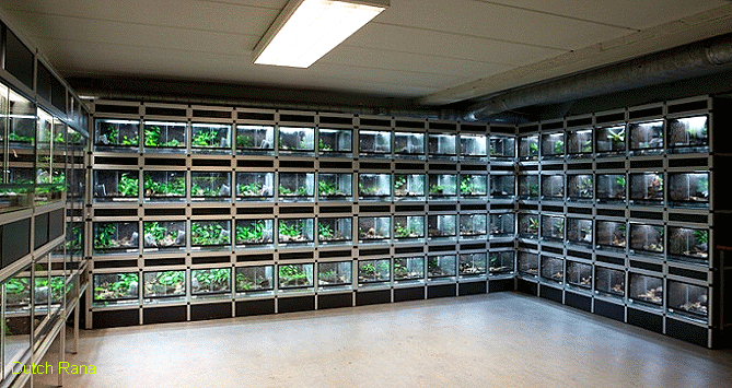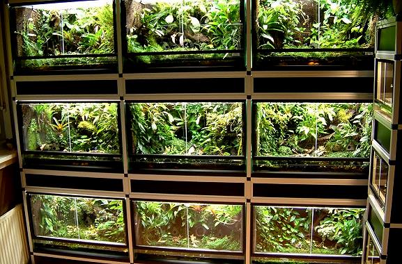 目前市面上箭毒蛙專用飼養缸價格平宜,密合度也不錯,因此在使用上相當理想.當然一般爬蟲缸稍加改裝也是可以的.而高溼度的維持就得仰賴定時的噴霧.如果只養少數2~3缸,可以使用 園藝植物噴霧壺每天手動噴霧,如果缸數較多,就有安裝高效率自動噴霧系統的必要性,省時省事.外出度渡假也不必擔心蛙缸變蛙乾.事實上,高溼度不只蛙類需要,經常做為蛙缸造景的陸生墨絲更為需要.