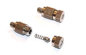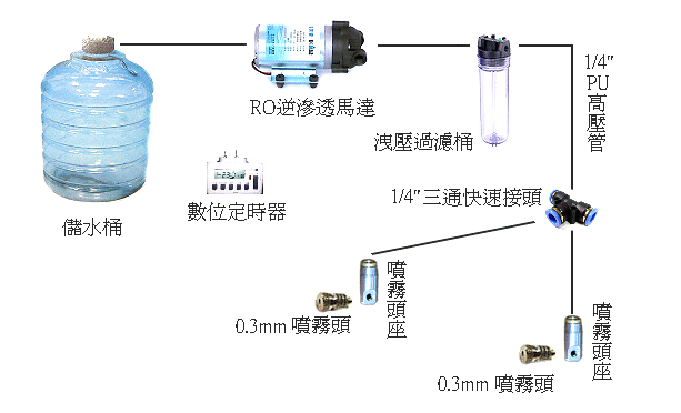 但是時間的長短與噴霧頭的孔徑也有相關.需要注意的是高壓管與快速接頭等都有6mm與2分(6.35mm或1/4")兩種,所以在購買時要注意各配件管徑的一致性.一般噴霧頭 也分為1,2,3,4,5號.1號噴霧頭孔徑0.15mm,2號0.2mm,3號0.3mm,4號0.4mm,5號0.5mm.孔徑越大,噴霧量越大,時間就可以越短.依據站長使用經驗,孔徑以3號最為適當.對一般蛙缸噴霧量足夠,又不容易堵塞.也不需要準備大儲水桶來儲存較大的水量.