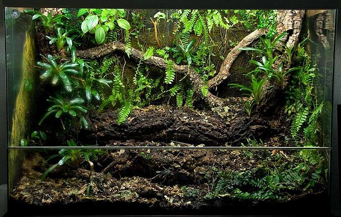 由於大多數的箭毒蛙都棲息在高海拔的熱帶雨林裡,終日雲物繚繞,因此最基本的飼養環境要注意兩個重點,那就是高潮濕與低溫.當然,以山區溫差的變化來說,肯定比平地來得大,所以如果能製造日夜的高溫差就是最完美的溫 控.由於兩棲類的皮膚是牠們呼吸的主要管道,而皮膚也必須保持在濕潤的狀態,才能進行氣體交換,完成呼吸作用,所以高溼度對於箭毒蛙的重要性甚至是高於溫度的.