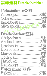 而箭毒蛙科(Dendrobatidae)一共包含了3個亞科,13個屬,170個種類之多.全部都分布在中南美洲的熱帶雨林中.由於還有許多未知的種類棲息於人跡罕至的蠻荒叢林之中,所以也經常會有新品種出現.像最近台灣市場上最夯的蠟筆小新 火焰箭毒蛙R. benedicata就是2008年才正式命名的種類.台灣也有極少量進口,不過高貴的身價,可謂箭毒蛙之冠.