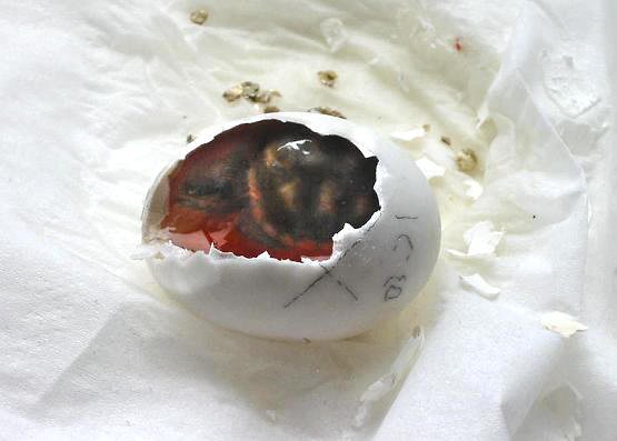 唯一比較遺憾的是,因為紅腿蛋有三顆燈光無法透視,只好冒險撥開一顆觀察,當蛋殼敲破後並未散發出臭味,心中便已經覺得不妙,恐怕是一顆好的蛋,再撥掉一些蛋殼,哇..........蛋殼中真的是一隻袖珍小小櫻桃紅腿,已經發育完成,只是尚未長大到可以破殼的程度,仍然包裹在蛋黃之中,血管密佈.最令人不捨的是,小櫻桃居然還會動!匆匆拍完照片,立即再將蛋蛋的破洞封住,放回孵蛋器中孵育.但願能夠順利孵化.