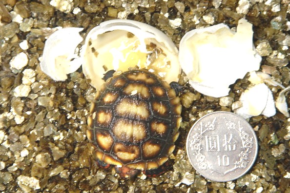 當初雌龜所產下的四顆蛋中一顆未受精淘汰,一顆過早開蛋檢視後來並未救活,一顆孵化,現在還剩一顆尚在孵育中,若正常的話,應該在一週內會孵化.