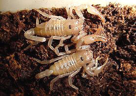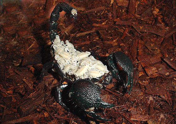 雌蠍的懷孕期長達6-9個月,因為幼蠍是與哺乳類一樣在母體中成長,屬於胎生蠍類.初生的幼蠍大約10-30隻,會全部聚集在雌蠍的背部渡過出生後最危險的前1-2週,脫離母體的幼體最好立刻移開飼養,以免被雌蠍吃掉.幼體經過2-3年就可以成熟.通常牠們可以活上八年.