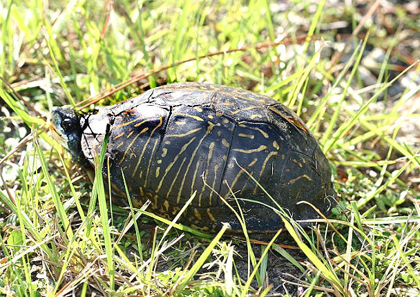 乍看之下,佛羅里達箱龜與錦箱龜的花紋十分類似,但是背甲較高