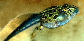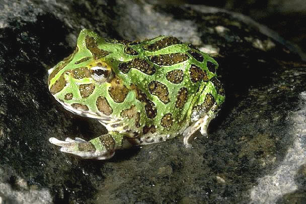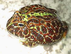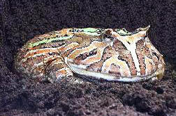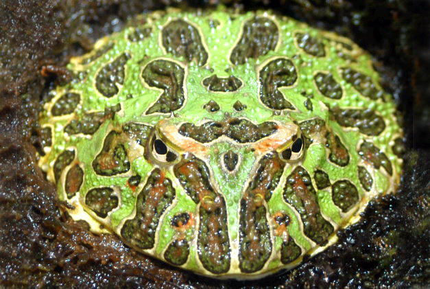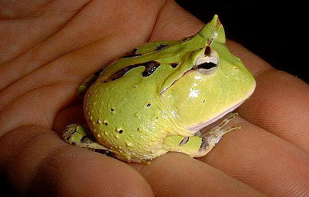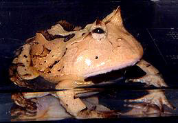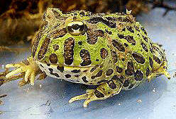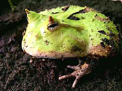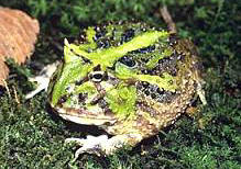 幼角蛙.幼蛙也是以隔離飼養比較安全.只要達到幼蛙階段,死亡率就會大幅降低.除了不小心吃到哽死或撐死,倒也沒什麼致命的病症會威脅到牠們的生存.牠們算是飼養蛙類最好的入門種類. |