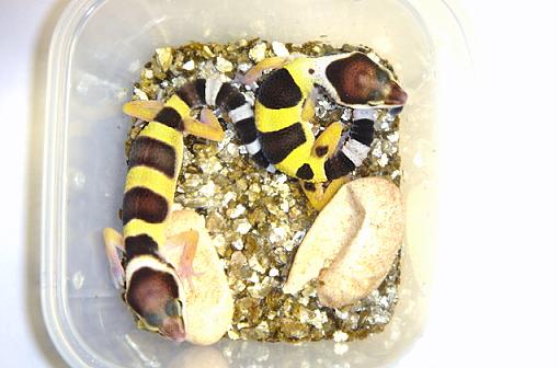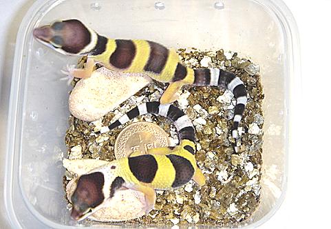 幾個月前開始注意豹紋產卵的動靜,終於在七月底先後採集到八顆蛋,其中六顆未受精,孵了一週以後變成牛奶蛋,蛋裡面都是乳白色液體.只有兩顆孵了37天之後孵化成功.由於四隻種母品係都不同,所以無法確定是那一隻種母所生,但是唯一的種公是普通高黃,這兩隻幼體想必都繼承了父親的體色.