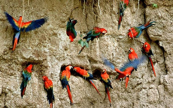 在祕魯Manu河畔共同啄食礦物質黏土的綠翅金剛和猩紅金剛鸚鵡