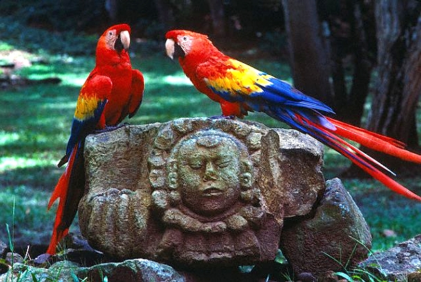 在印加帝國廢墟活動的猩紅金剛鸚鵡(也稱為五彩金剛鸚鵡)