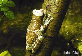 斑紋和體色變異不大                       牛奶蛙大都棲息於枝幹上而非樹葉上