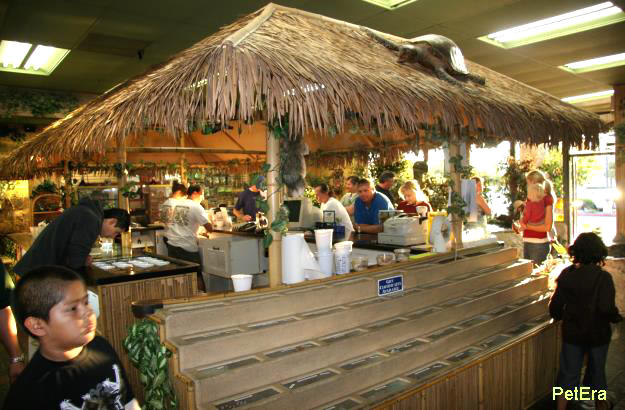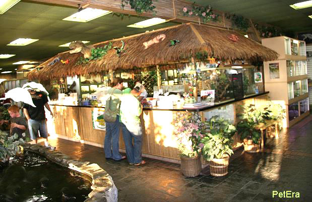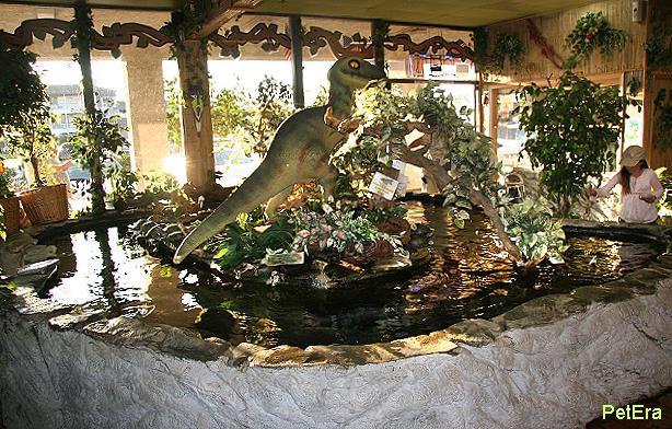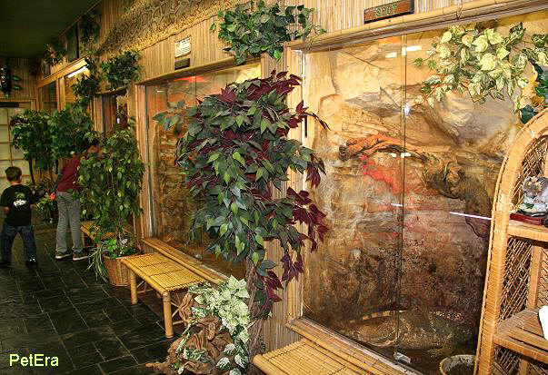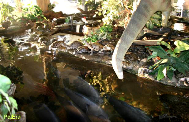 店內的水龜池與台北爬蟲館的水龜池類似,展示的都是一般北美水龜種類如巴西龜,紅肚龜等,水中則養了許多巨型銀板魚,可能與這家點原本是水族店有關,當初店主裝潢時就考慮到教育功能,所以這家爬店其實也滿類似動物園的形式.連櫃檯也設計成非洲式茅屋,的確 相當用心.