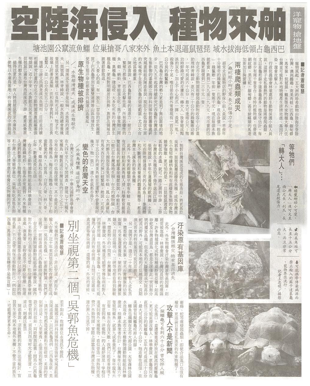 每隔幾個月,總是會看到報紙上刊載外來物種如何破壞台灣生態或是如何挾帶人畜共通病菌的的報導,這些消息大多數都已經不是新聞,可是這類報導總是會定期出現,雖然都是專家學者的意見,但也不是百分之百正確