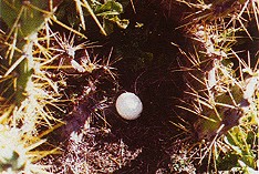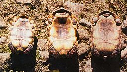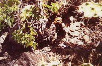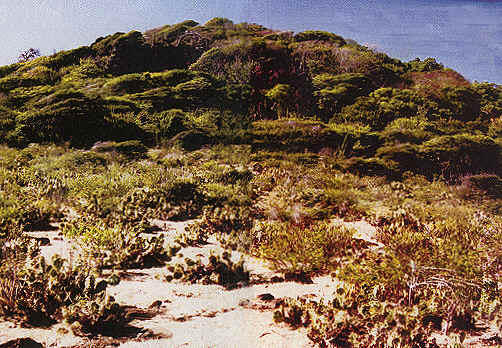 - 島上大部份地區寸草不生,只有小部份地區遍佈雜草和霸王仙人掌叢,這就是島上紅腿象龜的主食和棲身之所.本文作者一行七人在短短兩小時中就找到40隻紅腿,其中有31隻雌龜,5隻雄龜和4隻幼龜.雌龜較多的原因是因為牠們都露天產卵,太陽強烈照射下溫度過高,所孵出的紅腿就都是雌龜.大部份的紅腿都有隆背現象,可能是食物過於單調的緣故.島上的紅腿都把卵直接產於地面上,並未如同一般紅腿挖洞掩埋,也是一個異常的習性.
