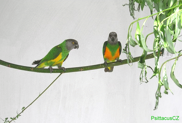 左邊是黃腹而右邊是橙腹塞內加爾鸚鵡腹部毛色明顯不同 |