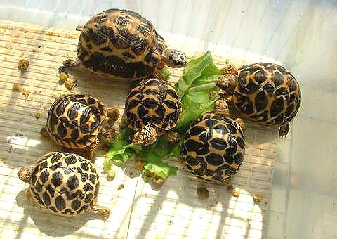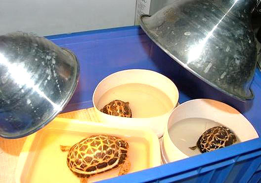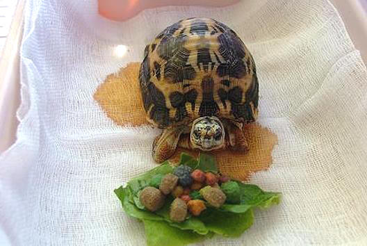經過每天浸泡溫藥水、清洗傷口、敷藥和藥物注射的連續治療,到了第四天兩隻較大的蛛網陸龜終於開始進食,體重也明顯的回升,