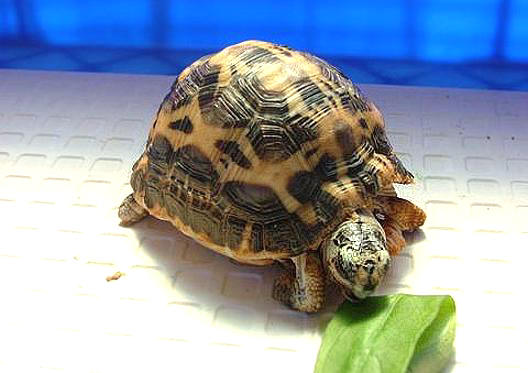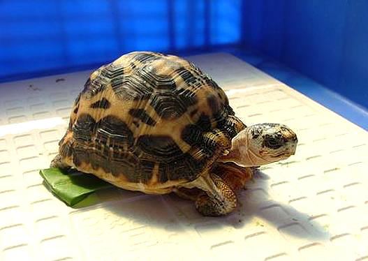 小蛛網陸龜來院治療兩個星期以來,除了第一天為牠清理傷口後精神有稍好轉外,前一個星期病情都沒再有任何的起色,期間更歷經了兩次嚴重的病情加重而奄奄一息,所幸都成功的搶救了回來;現在傷口已經完全癒合,不過右前腳的膝關節功能已經受損無法打直,只能彎著腳用整隻小腿支撐身體走路,雖然走起路來搖搖晃晃的,也無法把腹甲完全的撐離地面,但總算是可以順利的活動,這兩天也已經進食了少許的食物,應該是痊癒有望了。