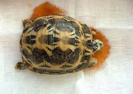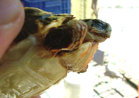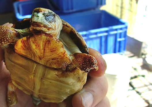 隔天一大早飼主又送來了一隻遭老鼠攻擊的蛛網陸龜,一樣是前腳遭到啃食,不過受傷情形並沒有前兩隻來的嚴重,就這樣三隻先後被老鼠咬傷的難兄難弟,就同在一起接受治療了。