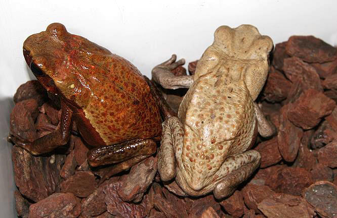 由於真蟾屬的種類多具有雙重性徵,所以必要時是可以變性的.也因此金背蟾蜍雌雄兩性都會鳴叫,要分辨雌雄,以體型大小會比較準確,雄性通常較小,拇指根部有黑斑.只要體型不要相差太多,牠們是可以群養的,不過以單獨飼養比較符合牠們的習性.