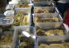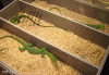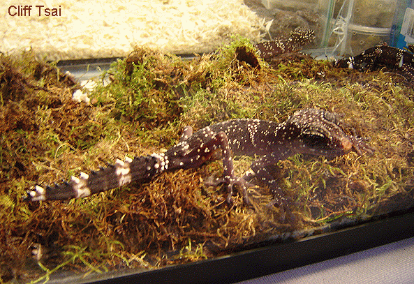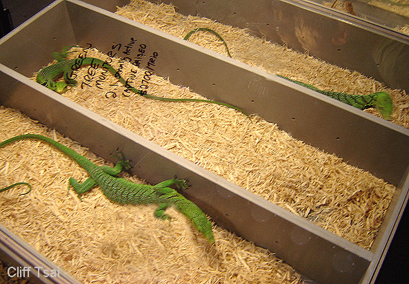 蜥蜴類出現了令人驚艷的南美鱷蜥以及松果蜥守宮類很可惜都放在小盒子裡孤單前往的我不敢單手開盒外加拍照深怕一路上不知要跑掉多少守宮不過RH屬的守宮看的令人垂延三尺可說是想看的通通有葉尾守宮種類之齊全也讓人看的大呼過癮變色龍則多半是高冠。(那三隻翡翠巨蜥人工幼體合售標價美金2700).