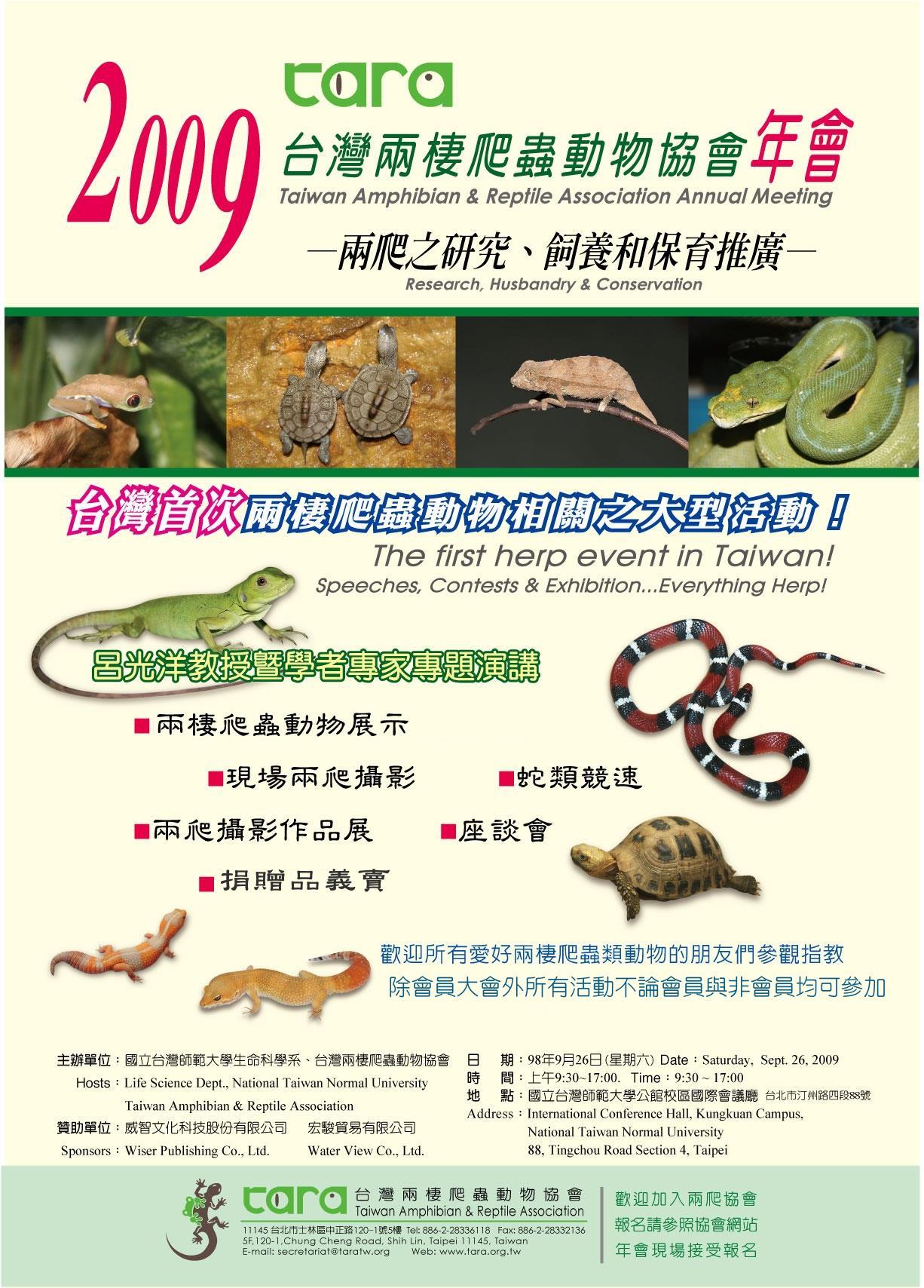 台灣兩棲爬蟲動物協會運作到現在即將滿一年了,在9月26日這一天,協會將會舉行公開的各項活動,包括舉辦第一次兩棲爬蟲類動物大展,詳細內容請參考海報.歡迎所有喜愛兩棲爬蟲動物的朋友們一起來瘋兩爬.