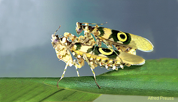 交配中之刺花螳螂雄性成體(上)體型比雌性瘦小很多 |