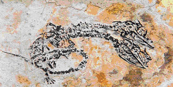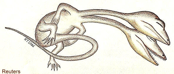 爬蟲類似乎特別容易出現雙頭的現象.而雙頭爬蟲類當中相對比較多見的應該算是蛇類,龜類則以人工養殖產量最大的巴西龜之類的北美澤龜最多.但是事實上在恐龍時代就有雙頭恐龍的出現.2006年在中國發現的這隻恐龍化石就是世界上唯一的例證.這隻恐龍是只有7公分長的初生幼體,是一種生存在1億2千萬年前的鱷科動物.