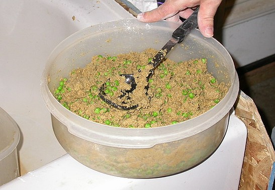 至於食物,Dix博士用來飼養王者蜥、陸龜和圓尾鬣蜥的主食完全一樣,只有一種。就是把冷凍的豌豆退冰之後再和泡過水的 陸飼料混合,然後再添加T-Rex的王者蜥專用粉以及Miner-All維他命鈣粉而成,雖然也會餵一