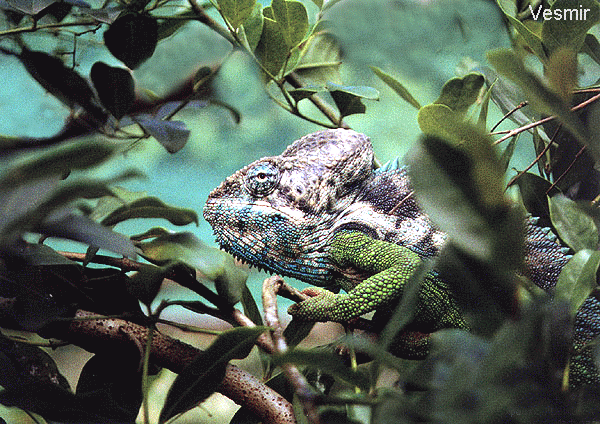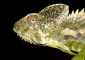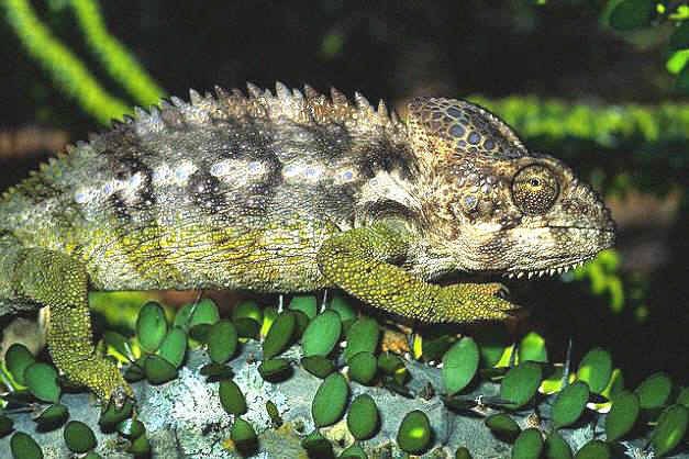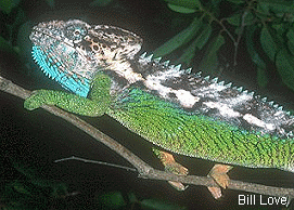 藍綠體色的巨人疣冠變色龍比較罕見 |