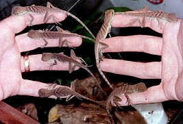 飼養環境以保持溼度為主要原則,以熱帶雨林的模式佈置,水龍都是日行性半水棲的爬蟲,底材可以樹皮屑混合無菌土舖成,溼度保持80%以上,每天必須噴水2次以上才能保持高溼度,UVB也是必須的.另外不能或缺的當然就是一個大水盆,水龍很喜歡靜靜的坐在水中泡水.只要飼養箱夠大,水龍是可以多隻雄性共養的.在食性上一樣是以昆蟲為主,蟋蟀,麵包蟲和小魚都是不錯的主食,蔬菜水果也可以餵食,成體還可以餵食乳鼠.維他命和鈣粉必須定期添加.
