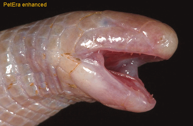 蚓蜥嘴部密生的利齒是獵食的工具仍須注意避免被咬傷 |
